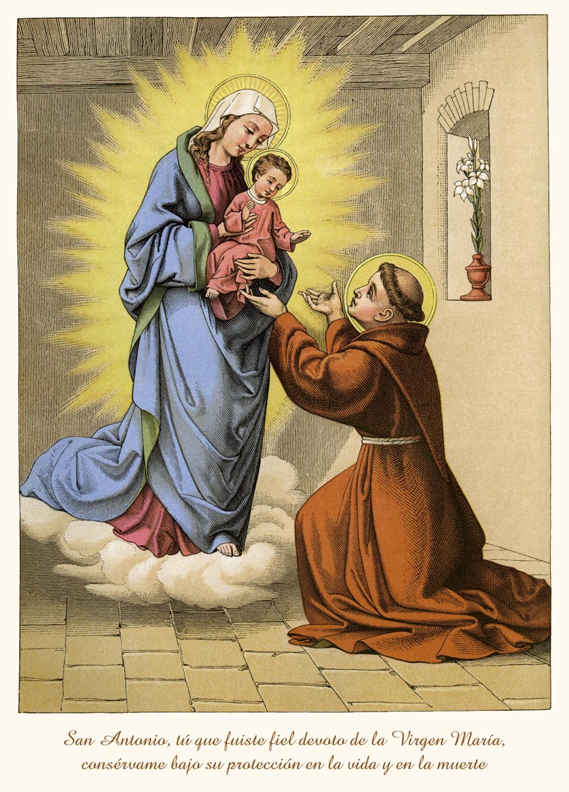 ¡Oh, admirable San Antonio, glorioso por los grandes milagros realizados, que merecistéis tener en vuestros brazos al Niño Jesús; obtenedme de su bondad la gracia que ardientemente deseo. Vos, que fuistéis tan misericordioso con los pecadores, no miréis mis pecados, sino la gloria de Dios, que será una vez más ensalzada por vos, y a la salvación de mi alma, unida a la súplica que ahora solicito con tanto anhelo.